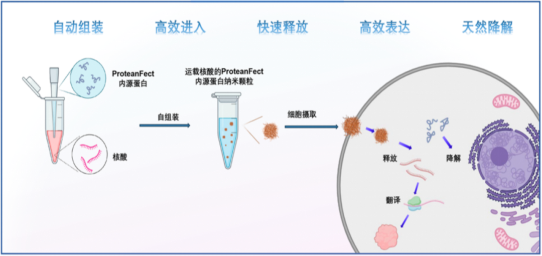 ProteanFect 内源蛋白与核酸分子(mRNA、siRNA)在体外形成稳定的纳米颗粒,确保核酸在递送过程中不被降解。