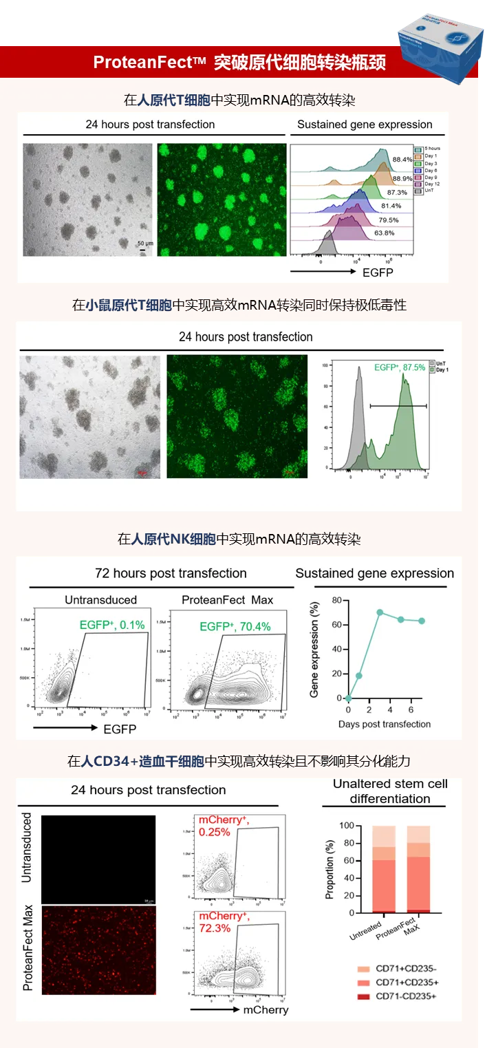 ProteanFect 转染试剂盒可高效、低毒地转染人原代 T 细胞、小鼠原代 T 细胞,以及人原代 NK 细胞和人 CD34+ 造血干细胞等原代细胞,且不影响干细胞分化能力(图1)。